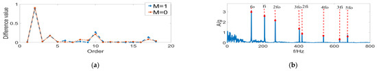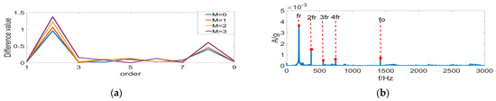 It is clear from Figure 7 that under complex operating conditions, the Sk value of random impulses is often larger than the periodic impulse sequence of signals, so that the filter fails to perform filtering in the frequency bands selected by the FK method, leading to the failure of fault identification. According to Figure 8, the filtering effect with the MCKD method is greatly compromised under the composite-fault condition, where the effective fault identification is hardly achievable. Figure 9a displays the differential Re result of PSR signals by the FSR-MCReD method when M = 1. As is clear, the differential Re values for two cycles are similar, with the maximum values both being 2. According to Figure 9b, since FSR-MCReD adopts the Re as the optimization condition, which is more robust to periodic simple harmonics and sporadic impulses, the decomposition and noise-suppression characteristics of PSR are fully exploited and integrated into the MCReD calculation, thereby enabling the preferable identification of composite faults.