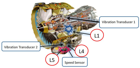 Bearings are the core components of aeroengines. Since the aeroengines are often tightly arranged, the vibration sensors can hardly be installed at the proximal end, which causes great difficulties in the feature-extraction of fault signals. Aeroengine vibration data were acquired from an accessory gearbox (Safran, France) [28]. Figure 10 displays the structural schematic of the aeroengine and the locations of sensors. At the L5 shaft location, outer ring spalling damage and retainer failure were present for the rolling bearing structure. Vibration sensors were arranged near the L1 and L5 shafts of the gearbox, while the rotational speed sensors were arranged on the L4 shaft. Measured data of vibration sensor 2 was selected for analysis, and the rotational speed and fault eigenfrequency were calculated according to the L4 shaft speed, the numbers of teeth on L4 and L5 shafts, and the bearing parameters of L5 rolling bearing (Table 3). Through comparison with the FK and FSC [29] algorithms, the ability of FSR-MCReD to extract features of aeroengine fault signals was verified.