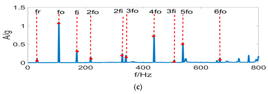 Figure 11 displays the envelope spectrum analysis results with the FK algorithm. As is clear, the FK algorithm has a good filtering effect. However, filtering errors are caused due to excessive and complex external noise, making it difficult to distinguish the fault features of the outer ring signals. Figure 12 presents the analysis results with the FSC algorithm. Clearly, the FSC algorithm has a good enhancement effect on the periodic signals. However, since it has no filtering effect, the fault features of outer ring signals are covered in substantial irrelevant signal features, making it difficult to diagnose faults accurately. Figure 13 displays the envelope analysis results with the FSR-MCReD. As is clear, after integration of PSR into the MCReD algorithm, both the signal filtering and decomposition effects are improved, thus enabling accurate fault-diagnosis.