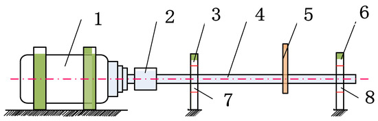 Experimental layout. 1. Motor; 2. coupling; 3. bearing housing I; 4. principal axis; 5. rotors; 6. bearing housing II; 7. bearing I; and 8. bearing II.
