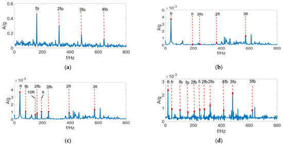 Figure 16 displays the envelope spectrum analysis results with the aforementioned four methods. As is clear, the MCKD method has a good effect on signal feature-extraction under single-fault conditions, which, however, easily falls into a local optimum. Thus, it hardly achieves feature extraction or enhancement for other coexisting periodic impulse signals. The non-iterative method OMED exhibits the worst effect of fault feature-extraction, which can hardly diagnose faults. In the case of MOEDA, the results of fault feature-extraction are incomplete since it is an improved version of OMED, which does not consider the condition of multiple fault coexistence. With the FSR-MCReD method, the simultaneous existence of multiple faults is considered, and Re, which has good stability for both sporadic impulses and harmonics, is used as the performance index. Moreover, PSR is integrated for performing deconvolution, so that the subspace signals containing more fault information are extracted, thus preferably achieving the feature extraction under composite-fault condition. However, it is noteworthy that the second- and third-order inner ring fault features are lost during feature extraction since part of the subspace is truncated in PSR.