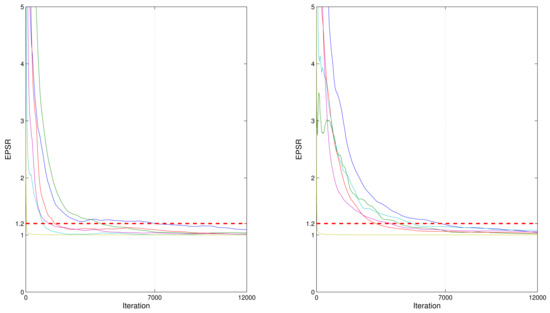 EPSR values of all parameters against iteration numbers for a randomly selected replication in the first simulation (left panel) and second simulation (right panel).