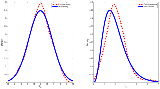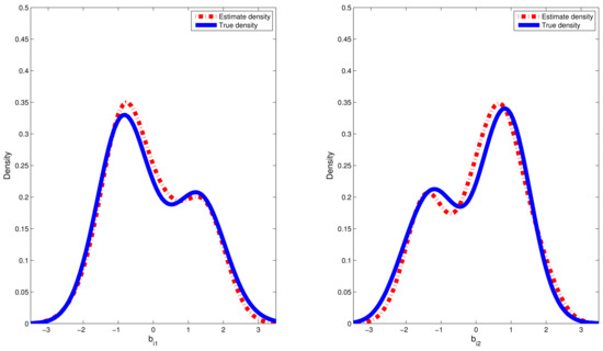 where and denote, respectively, the true density function for random effect and kernel density estimation for the estimated values of random effect ; is chosen to be the th quantile of the dataset . The sample quantiles for the estimated values of RMSE are reported in Table 2. Furthermore, we chose a typical replication whose RMSE value is equal to the median in the 500 replications. Therefore, on the basis of the selected replication, the estimated densities of and based on the CDPMM prior against their corresponding true densities are plotted in Figure 2 and Figure 3, which indicated that the finite mixture of normal distributions can flexibly capture the symmetric, skewed and bimodal shapes of random effect . From Table 2, based on the results of 500 replication in both simulations, the estimated means and standard deviation (SD) of random effects and is approximate to their corresponding true values, the 25%, 50% and 75% quantiles of values are small and close enough, which indicated that it is robust to apply CDPMM method to estimate random effects. All these findings indicated that (i) our proposed Bayesian procedure could capture the true information of well, regardless of their true distributions and forms, and (ii) BLasso could identify the true model with a high probability.
