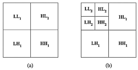 DWT is used to transform an image from spatial to frequency domain, which can decompose an image into four sub-bands known as LL, LH, HL, and HH sub-bands, and provide the low resolution, the horizontal, diagonal, and vertical details of the image separately in the spatial domain [16]. Compared with the discrete cosine transform (DCT), DWT has less computational complexity and is more favorable in image processing for the utilization of informative wavelets with details from both spatial and frequency domains rather than merely frequency as in DCT. In particular, the precise spatial frequency localization of DWT allows for the exploitation of the masking effect of the human visual system (HVS) so that only the region corresponding to a modified DWT coefficient would be changed [17]. Several wavelet filters could be chosen to perform the 2D-DWT, such as Coiflets, Haar and Daubechies, etc. As shown in Figure 1, DWT could be iteratively executed on a signal to split it into low and high-frequency sub-bands level by level until a sufficient decomposition is obtained [18]. In our scheme, we choose 1-level DWT [19,20] with the Haar wavelet filter for the low computing complexity and high image resolution.
