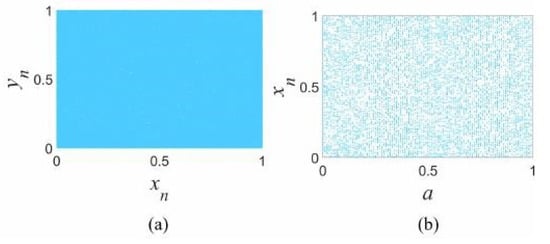 where a, b, c, d, and e are the control parameters, and a is defined in the range [0,1]. We set a = 0.5, b = 4, c = 4, d = 2, and e = 2, the phase diagram and bifurcation of TL-COTDCM is shown in Figure 2. It is obvious that the phase diagram of this system is able to fill the whole 2D space, indicating the complex nonlinear dynamics characteristics of TL-COTDCM.
