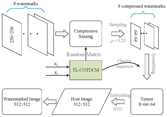 To maximize utilization of the capacity of host image, we perform CS on original watermark images to compress them into smaller sizes for embedding. Here, we use a sampling rate of 0.25 for a trade off between image quality and compression ratio, which means that only 25% of the information of the original watermark images are used for embedding. Then, the compressed watermarks are encrypted by using the order of a sorted TL-COTDCM sequence again to achieve a higher level of security. Two initial values are defined as secret keys for the TL-COTDCM to generate the chaotic sequence.