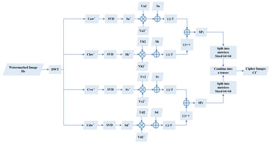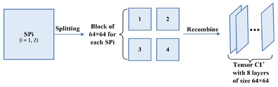 - Split the aforementioned and into four matrices separately with a size of . Then, form these eight matrices into a tensor , which is the extracted encrypted watermark images. This step is illustrated in Figure 6.
