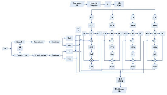 - Calculate the embedded DWT components with U and V obtained in Step 3:where .