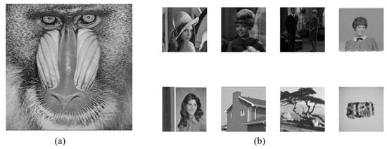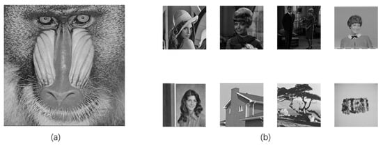 The experiments are conducted on a PC running Windows 11 OS with x64 processor, 16 GB RAM, and 2.11 GHz CPU, and the corresponding codes are executed on the Matlab R2021a. As shown in Figure 8, the test images include the grayscale host image “baboon” and eight grayscale watermark images with a size of , which are downloaded from the widely used public image database USC-SIPI. We compare our method with several existing recent ones which include the hybrid blind digital image watermarking methods [33], visually meaningful image encryption scheme based on a single chaotic map [18], blind color image watermarking method based on DWT and DCT [34], blind digital image watermarking based on Henon Chaotic Map and Elliptic Curve Cryptography [35], and secure and robust digital watermarking scheme based on logistic and RSA encryption [36]. The evaluated indicators involve capacity, imperceptibility, robustness, and security.