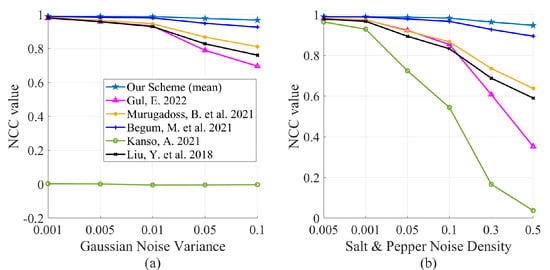 NCC values under noise attack. (a) Gaussian noise attack; (b) Salt and Pepper noise attack [18,33,34,35,36].