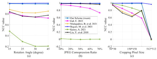NCC values under geometric attack. (a) rotation attack; (b) JPEG compression attack; (c) cropping attack [18,33,34,35,36].