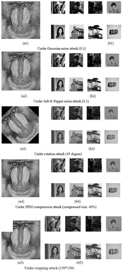 Images under various attacks. (a1–a5) denote attacked watermarked images; (b1–b5) are the extracted watermarks.