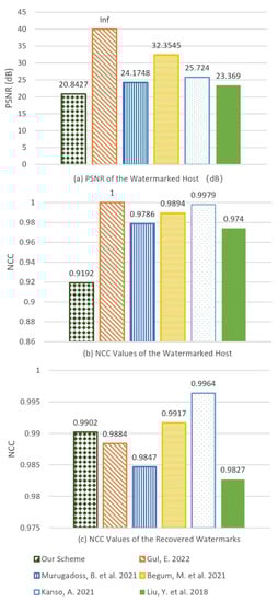 Comparison of impercipient of watermarks in different methods. (a) PSNR values of the host image; (b) NCC values of the watermarked host image; (c) NCC values of the recovered watermarks [18,33,34,35,36].