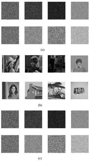 - Reshape into a tensor composed of eight matrices of size . Then, we obtain the compressed and encrypted images;