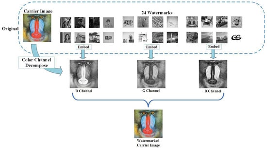 The flowchart of watermarks embedding for color image. (a) original color host image; (b–d) 24 grayscale watermarks.