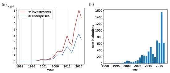 In the western world, the VC industry emerged in 1946 and experienced its first boom and bust cycle from 1982 to 1993 [12]. While in China, VC is still a relatively newly emergent industry (see Figure 1a). Before the 1990s, China received few VC investments. After 2000, The size of the annual investment amount and the number of investment activities underwent a rapid increase, and they both manifest a roughly five-year cycle (see Figure 1a). From 2014 to 2017, there was a spur of VC institutions that around four thousand new VC institutions entered the market (see Figure 1b), which further indicates the urgency of developing a quantitative science of VC institutions.
