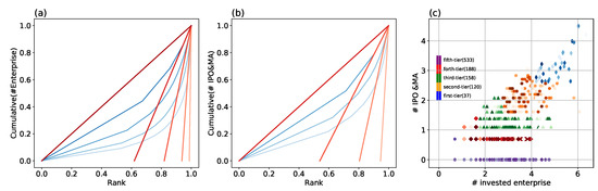 Our iterative Loubar method works as follows: First, ascendingly ordering all VC institutions according to their number of investment deals, accumulate their values on the vertical axis, and normalize both axes by the corresponding maximum (i.e., normalize the data by the cumulative number of investments for the vertical axis, and the number of VC institutions for the horizontal axis). This curve is also named the Lorenz curve [32] (see the lightest blue curve in Figure 2a). Then take the derivative of the Lorenz curve at and extrapolate it to the point at which it intersects the horizontal axis, which gives us an objective threshold to separate the first level of VC institutions from others on this indicator. All VC institutions above this threshold will be classified as temporary level 1 on this indicator. The same process is repeated on the other indicator, here, the indicator is the number of IPO&MA (see Figure 2b), which will also classify some VC institutions into level 1 on this indicator. Eventually, only the VC institutions in both level 1 on the two indicators can be classified as the first category (named “first-tier”, see Figure 2c).