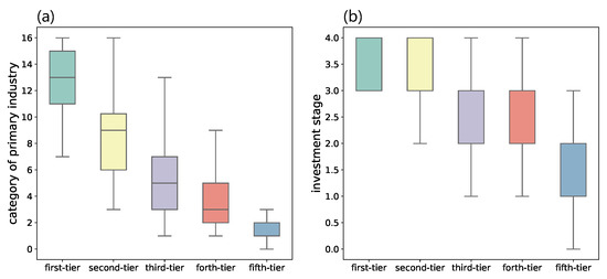 We eventually classified firms into five categories. Those leading VC institutions in the first category are labeled as “first-tier”, the ones in the following are categorized as “second-tier”, “third-tier”, “forth-tier”, and “fifth-tier”, respectively (see Figure 2c). The VC institutions classified into the first category (e.g., Starter Story, Statista, Sequoia Capital China, and China Growth Capital) by our method are in accordance with authority ranking reports, which rank VC institutions based on their capability in earning money, reputation, investment frequency and so on [37]. Compared to the first category, the ones in the second category (orange hexagon in Figure 2c) have fewer investments or IPO and M&A. This group also contains VC institutions with a large number of investments (in level 1 on this indicator) but fewer IPO and M&A (level 2 on the other indicator), and vice versa. The majority of VC institutions in the fifth category (“fifth-tier”, see purple hexagons in Figure 2c) have only a few investments and IPO and M&A exits, but there are some VC institutions that make a large number of investments but end up with quite a few successful exits, which generally have a worse investment performance and much less successful.