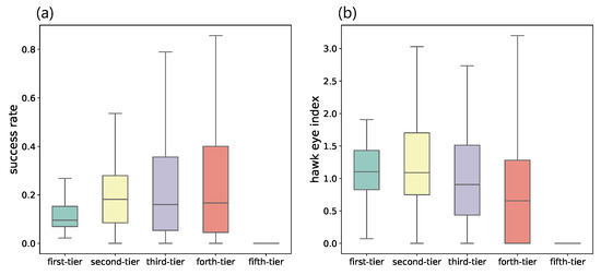 Comparisons between VC institutions from different categories on (a) the success rate, which is measured by the fraction of invested startups that exit through IPO or M&A, and (b) the hawk eye index (HEI). Note that the first-tier category has a low median success rate but the highest median HEI, which indicates that they tend to invest more money on eventually successful startups out of a large number of alternative choices.