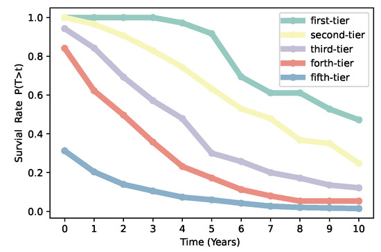 In addition, VC institutions play an important role in the development of the economy, their survival rate and sustainable development are closely related to economic growth. Here, the survival rate is defined as the proportion of VC institutions that have yet to continue to invest after t years after their first investment. We calculate the survival rate of VC institutions from different categories obtained by our iterative Loubar classification method. We find that the longevity curves rank in decreasing order in accordance with ordered categories by our iterative Loubar classification algorithm that VC institutions from the first-tier have the highest survival rate and the fifth-tiers have the lowest (see Figure 5). Based on statistical analysis, Govindarajan et al. discovered that nearly 40% of companies cannot survive within the first 5 years [40], which is just an average for the whole market, but the whole system can be quite heterogeneous. From Figure 5, we can observe that over 95% of first-tier VC institutions can survive over 5 years, while more than 90% of fifth-tier VC institutions died in 5 years after their first investment. The variety of survival rates might be caused by the heterogeneity of VC institutions. The longevity survival curves, which rank in decreasing order for first-tier to fifth-tier VC institutions, also confirm the effectiveness of our iterative Loubar classification algorithm.