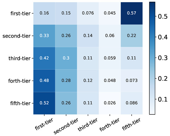Syndication probability of VC institutions from different categories. The first-tier group and the fifth-tier group have the highest tendency to make joint-investment with VC institutions within the same category. Each row is subject to normalization, but each column is not subject to normalization.
