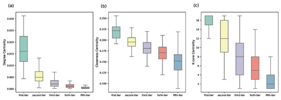 The syndication patterns can be better revealed through a complex network perspective. If two VC institutions make a joint investment, then we connect these two nodes in the network. We further compare the structural differences of VC institutions from different groups via computing the degree centrality, closeness centrality [41], and k-core centrality [42]. Degree centrality measures the number of edges that a VC institution has in the joint-investment network. With more ties, a VC institution usually has more investment opportunities and better deal flows [12]. Closeness measures its average distance to all other nodes that VC institutions with a high closeness centrality are averagely closer to other nodes [43]. The coreness (also referred to k-core) is a more sophisticated centrality measure, which can be obtained by iteratively removing vertices with a degree less than k [42] or by iterating the H-index operator [44]. The core-periphery structure indicates a higher-order organization in the VC syndication network. VC with a high k-core value is generally in a more central position with a stronger influence in the network [42]. We find that the VC institutions from different categories are of typically different values, and the first-tier category are more central than VC institutions from other categories (see Figure 7). From first-tier to fifth-tier VC institutions, there is a clear decreasing trend on all these network indicators, which also confirms the effectiveness of ranking for groups obtained by our iterative Loubar method. We further validate the quality of classification by our algorithm by comparing the structural differences with the algorithm proposed by Yang et al. [24], which uses a weighted k-means method to identify leading VC institutions and classify VC institutions into different groups. Recent evidence indicates that weighted k-means is a pretty good clustering algorithm for grouping VC institutions when compared with other clustering methods [24], and thus in this paper, we compare our classification results with the weighted k-means clustering algorithm. We discover that groups identified by the weighted k-means algorithm have no significant difference on all three network centrality indicators (see Figure 8). Since network centrality measurements are classical ways of quantifying how important a VC institution is, our algorithm has a better classification performance.