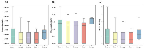 The difference between VC institutions of five categories identified by the weighted k-means algorithm [24], which cannot rank obtained clusters, on three network centrality indicators: (a) degree; (b) closeness; and (c) k-core. Note the only denote different groups but not the rank.