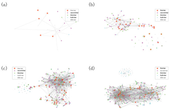 In this work, to get their vector representations, based on the accumulative joint-investment networks, we embed VC institutions into a 100-dimensional metric space, which is suggested by the recent advance on determining an appropriate embedding dimension [47]. To visualize the embedding vector, we use t-SNE [48] to project the high-dimensional vector representation into two dimensions. We visualize the syndication evolution process in Figure 9 and we can tell that there are only a few VC institutions that have joint investments before 2000. Compared with the VC institutions from other categories, first-tier and second-tier VC institutions entered the Chinese market at a relatively earlier time (see Figure 9a). But some first-movers might be less successful and fall into lower-ranked categories (see Figure 9a). In 2003, many first-tier VC institutions already take the central position (see Figure 9b), which indicates that their investments play a key role in the Chinese VC industry. The syndication around first-tier and second-tier VC institutions began forming densely connected communities. VC institutions with fewer syndication events are located far from the majority (See Figure 9b–d), among which we notice several first-tier VC institutions that entered the investment market for the first time. These VC institutions are sort of rising stars that started from the fringe of the network but ended up as a superstar with a central position. They gain good opportunities to syndicate with second-tier and first-tier VC institutions and gradually move to the densely connected elite community (see Figure 9c,d). It is worth noting that there are two separate groups in the Chinese market, one of which is mainly consisted of VC institutions from the forth-tier and fifth-tier categories, which are in accordance with the results presented in Figure 6. The fifth-tier group has a densely connected structure among them, so they might have limited opportunities to source high-quality deal flow (i.e., select promising startup companies) and to nurture investments (i.e., add value to portfolio companies) [12].