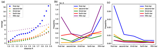 As shown in Figure 10a, the average number of VC institutions that are in the vicinity of a first-tier VC institution varies significantly across categories. VC institutions in the first-tier category are more central as the average number in their vicinity grows faster when R is larger. We discover that there is a plateau for a first-tier VC institution to encounter other first-tier ones when R is around 1.2 to 1.5, that there is no clear significant increase. This suggests the existence of possible territories of first-tier VC institutions that generally a few of them would dominate a certain range, where no more other first-tier institutions can be encountered. We then set , which resides in the plateau phase, and we find that first-tier VC institutions are surrounded by many fifth-tier VC institutions (indicated by a large fraction of entities in the fifth category, see the first value of the purple line in Figure 10b), while first-tier VC institutions themselves seem to avoid each other, which is indicated by a near-zero fraction. While fifth-tiers are either closer to first-tier VC institutions or closer to each other. When we look at a wider range, e.g., (see Figure 10c), first-tier VC institutions are still much closer to each other than the rest. This indicates that the first-tier VC institutions cooperate frequently, but they all have some smaller VC institutions that are only closer to themselves, which might form their own territories.