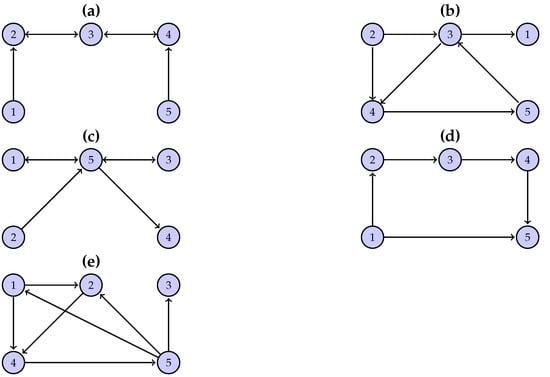 The graphs of the connectivity structure of the simulated systems: (a) open-chain structure (S1), (b–d) randomly chosen structure for (S2)–(S4), respectively, and (e) vector autoregressive process (S5).