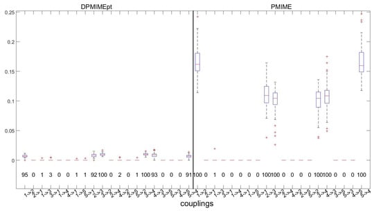Boxplots of DPMIMEpt () and PMIME for all variable pairs of S1, for 100 realizations of the system S1, using and . At each panel, the number of times the causal effect is detected is displayed below each boxplot.