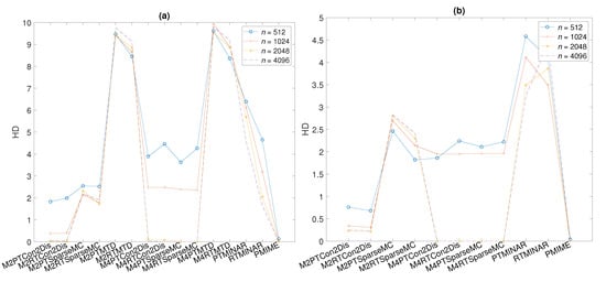 Similar results as for MCC in Table 3 are obtained using the performance index HD, as shown in Figure 3a. The misclassification is larger when the time series gets smaller (from 4096 to 512) for the same number of symbols M, and when M gets larger (from 2 to 4) for the same n. However, the HD is at the same level for all these settings for DPMIMEpt and DPMIMErt, and for both measures, it converges to zero (no misclassification of all 20 variable pairs) for , as does PMIME even for small n.