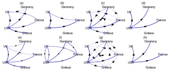 All causality measures suggest the USA market has a causal effect on many other markets before and after the GFC. In the DPMIMEpt networks (Figure 4a,e), there is in additional causal effect from UK to Germany in both the preGFC and postGFC periods, while the driving from France to UK in preGFC reverses in the postGFC period. Regarding the latter, the PMIME networks show the opposite, UK to France in preGFC and France to UK in postGFC (Figure 4b,f). The PMIME networks show no causal effect of USA on Greece in both periods, which has no straightforward interpretation. In the postGFC period, the PMIME finds a bidirectional causal relationship for the USA and UK. The CGCI measure gives almost full networks in both periods (Figure 4c,g), failing to reveal any particular connectivity structure in the system of the five national markets. On the other hand, the PTE turns out to be the most conservative measure, giving only the causal effect of the USA to UK, Germany and France (not Greece) in both periods (Figure 4d,h).