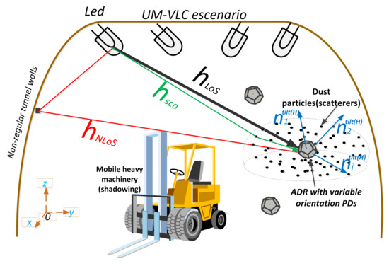 - Játiva, P.P.; Azurdia-Meza, C.A.; Sánchez, I.; Seguel, F.; Zabala-Blanco, D.; Firoozabadi, A.D.; Gutiérrez, C.A.; Soto, I. A VLC Channel Model for Underground Mining Environments With Scattering and Shadowing. IEEE Access 2020, 8, 185445–185464. [Google Scholar] [CrossRef]
