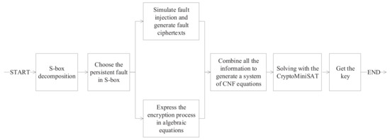 The flowchart of algebraic persistent fault analysis based on S_box decomposition.