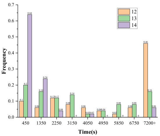 The Table 8 shows that when the setting time is 2 h and the number of ciphertexts is 12, the success rate is 54%. When the maximum solving time is relaxed to 10 h, the success rate of the solving for the same experimental samples reaches 92%, where the shortest solving time is 459.5 s. In our study, in order to explore the minimum number of ciphertexts that can be used to achieve key-recovery, the number of ciphertexts is further reduced to 11, 10 sets of samples are randomly selected, the maximum solving time is set to 10 h, and the attack is judged to failure after 10 h. The experimental results show that 50% of the samples can be solved within the specified time, and the shortest solving time is 1930.9 s. Figure 6 gives the histogram of the solving time distribution for the number of faulty ciphertexts of 14, 13, and 12. From Figure 4, we can find that as the number of faults decreases from 14 to 12, the number of samples that complete key-recovery within 450 s decreases from 64% to 10%, while the number of samples that do not complete key-recovery within 7200 s increases from 6% to 46%.