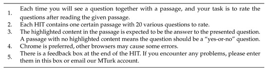 - Ji, T.; Graham, Y.; Jones, G.J. Contrasting Human Opinion of Non-Factoid Question Answering with Automatic Evaluation. In Proceedings of the 2020 Conference on Human Information Interaction and Retrieval; Association for Computing Machinery: New York, NY, USA, 2020; pp. 348–352. [Google Scholar]