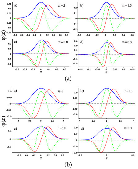 The normalized wave functions as a function of position x for single-well potentials (see Panel (a)) and (Panel (b)), respectively. The solid blue line, red dotted line and green dashed line denote the ground state, the 1st and 2nd excited states, respectively. The noninteger n is taken as , respectively.