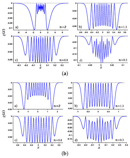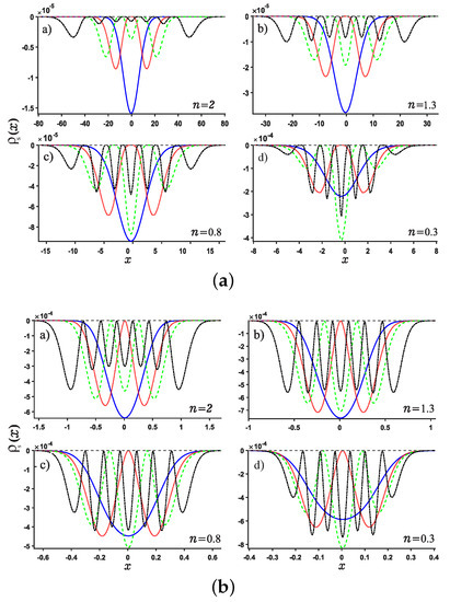 Plots of position entropy density for normalized 11-th excited state for potential wells (see Panel (a)) and (see Panel (b)). For each Panel, Panels (a–d) are plotted for different values of n.