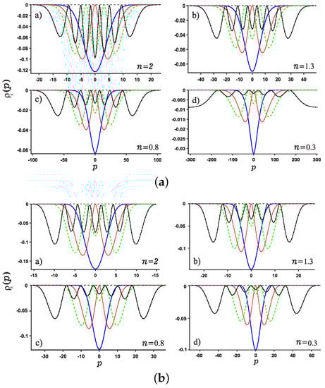We are now in the position to present the results of this work. Motivated by our recent study about Shannon entropy in multiple well quantum well system in fractional Schrödinger equations [45], we present the normalized wave function, the position and momentum entropy densities and as well as the Shannon entropy. For simplicity, we show the results for the ground, the first, second, sixth excited states and much higher excited 11-th state. As shown in Figure 3 and Figure 4, we show the variation of the position and momentum entropy density as functions of the variables x and p, respectively. The ground, the first, second and sixth excited states are denoted by solid blue line, red dotted line, green dashed line and black dash-dotted line, respectively. Likewise, the values of noninteger n are taken as , respectively. It is found that the position entropy density becomes more localized but the momentum entropy density is more delocalized as the noninteger n decreases. For example, the crest of the wave function for the ground state decreases gradually but those for the excited states increase gradually with the decreasing n. However, for the case of momentum entropy density as shown in Figure 4, the crest of the wave function for the ground state decreases gradually as the n decreases.