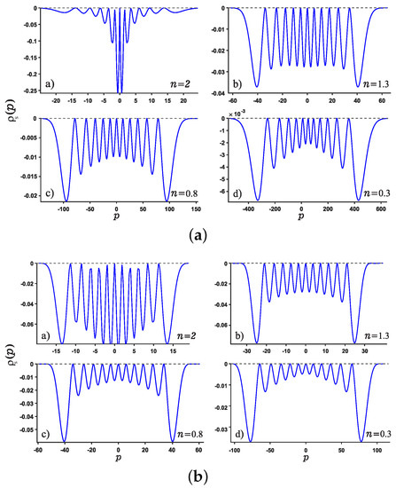 Up to now, due to the computational complexity of quantum information of the fractional Schrödinger equation including the calculation of the wave function and the Fourier transform, almost all authors have paid attention to the quantum information of the traditional Schrödinger equation, i.e., the derivative number except for our previous study [45], in which was taken. In that work [45], we have carried out the quantum information entropies of multiple quantum well systems in fractional Schrödinger equations. Recently, we have studied the Shannon entropy of the traditional () Schrödinger equation [29] with these two potentials (1) as shown in Figure 1, but we do not show how the fractional derivative n affects the wave function and the relevant physical quantities such as the position and momentum probability density as well as the Shannon entropy. Moreover, in the present study we will display their behaviours through taking the noninteger , which is different from our previous study taken in Ref. [45]. Certainly, we will see that the calculation results would become not ideal when n is taken too small. On the other hand, in order to compare with the global characteristic of Shannon entropy, it is necessary to study the locality of Fisher entropy.