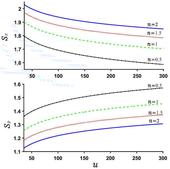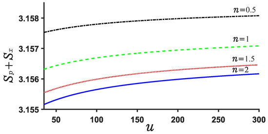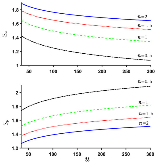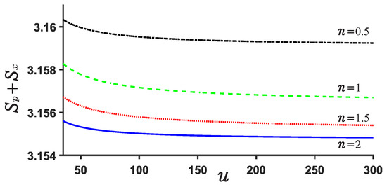 Now, we explore the Beckner Bialynicki-Birula–Mycieslki inequality. This inequality is still satisfied for both potential . This can be verified by Figure 7, Figure 8, Figure 9 and Figure 10. Figure 7 and Figure 9 show the position and momentum entropy and as a function of the depth u for the potential wells . For simplicity, we consider the ground state for two potentials. We notice that the position entropy decreases with increasing depth u of the potential well but decreasing noninteger n, but the momentum entropy is contrary to that of case. In Figure 8 we observe the sum for decreases with the depth u of the potential well, while that of case increases with depth u. This implies that the sum for will become more stable than that of case when the depth u increases. Certainly, their sum always remains above the minimum value of the value . On the other hand, we notice from Figure 8 and Figure 10 that the difference of the sums for various n is very small and the sum is always around 3.15.
