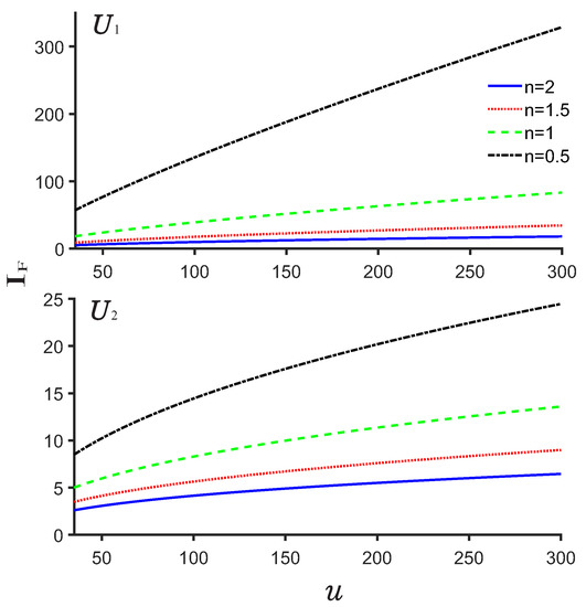 Finally, let us show the plots of the Fisher entropy as a function of the depth u of the potentials. As shown in Figure 11, we observe that the Fisher entropy increases with the increasing u but with the decreasing n for both potentials . The Fisher entropy for is greater than that of the . This can be explained well by the shape of the potentials since the potential is narrower than .
