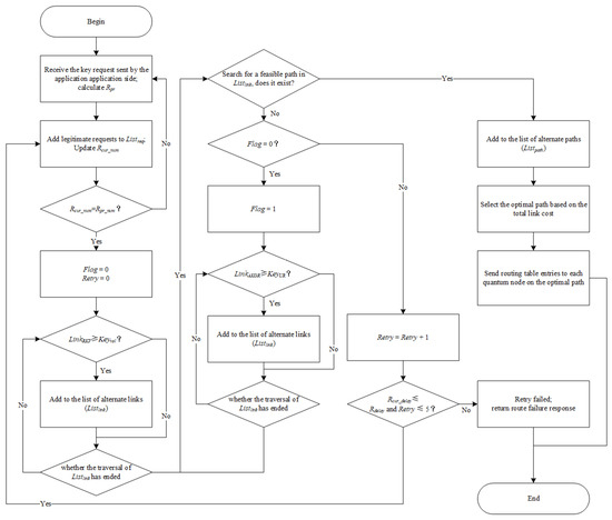 Quantum key distribution (QKD) technology [1], which encodes and transmits optical quantum signals, relies on the basic principles of quantum mechanics such as the Heisenberg uncertainty principle and quantum unclonable theorem to guarantee the unconditional security of secret key negotiation [2,3]. Once there is eavesdropping, both parties to the communication can detect it immediately. By connecting multiple point-to-point QKD systems to build a QKD network, users can be offered long-distance and networked key services [4,5,6]. With the continued evolution of quantum key networking technology, quantum keys have increasingly progressed closer to practicality. However, the current QKD networks are still in the experimental stage, and researchers have developed some simulation platforms [7], but their practical deployment is still difficult to realize due to complexity and high cost. To truly integrate into people’s daily lives, a variety of practical issues need to be taken into account. One important issue is that the dramatic increase in the number of network nodes as well as users will lead to increasingly complicated network topology [8], in which case an efficient routing scheme is highly critical.