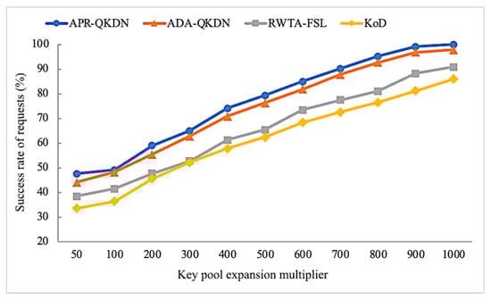 As can be seen in Figure 4, the success rate of requests of APR-QKDN and the other three schemes show an increasing trend as the key pool expansion multiplier increases. The reason is the number of keys that can be stored locally by the quantum nodes will increase as the key pool expansion multiplier increases, making the network resources gradually abundant and thus able to satisfy more requests. Simultaneously, the success rate of requests for the APR-QKDN scheme has a significant performance improvement compared with KoD and RWTA-FSL for a certain key pool expansion multiplier. The difference between APR-QKDN and KoD is maintained at around 15%, and the difference with RWTA-FSL is about 10%, which is due to the appropriate path costing strategy chosen by APR-QKDN. Our scheme achieves a performance gain of roughly 5% in the success rate of requests compared to ADA-QKDN, which is attributed to the adaptive prioritization of application requests.