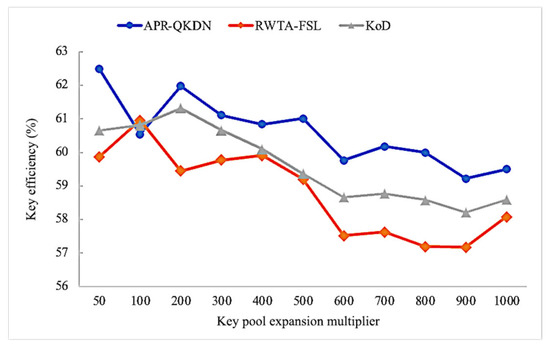 As shown in Figure 5, with the gradual increase of key pool expansion multiplier, the overall key efficiency rate of each scheme displays a falling trend. When the key pool expansion multiplier is large, the key pool capacity of the node will be much larger than the total amount of keys requested by the application, each scheme will give priority to allocate the remaining local key amount and may overlook the paths with sufficient link time slice resources but lesser hop count. Therefore, it is vital to set the proper key pool capacity and not to pursue the key pool expansion. Although KoD and RWTA-FSL both execute routing based on the shortest path algorithm, the key efficiency of APS-QKDN still has some advantages, but the overall difference is not significant. Among them, our scheme maintains a gap of roughly 3% with RWTA-FSL and has about 2% improvement compared to KoD.