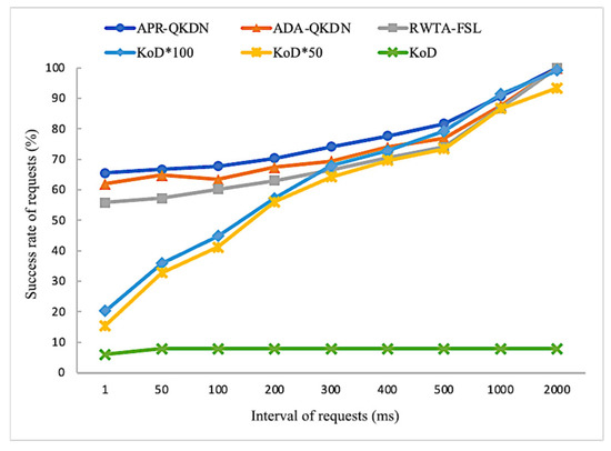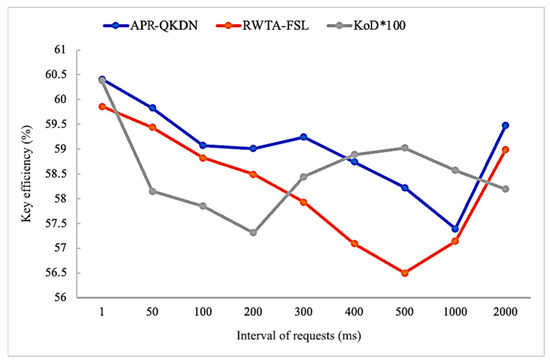 As shown in Figure 6, the success rates of requests of APR-QKDN, ADA-QKDN, RWTA-FSL, and unscaled KoD change slowly with an increasing interval of requests, and APR-QKDN has a persistent performance advantage over other schemes when the interval of requests is small. Compared with ADA-QKDN, our scheme has about 5% improvement in the success rate of requests; compared with RWTA-FSL, it has about 10% improvement; compared with unexpanded KoD solution, it has at least 60% improvement; compared with KoD solution with 100 times expansion, it has about 30% improvement on average when the request interval is small. When the request interval exceeds 1000 ms, the performance of the highly expanded KoD scheme gradually surpasses that of APR-QKDN, mainly due to the key replenishment under the long idle period and the solid equipment foundation built by the large-capacity key pool. However, it would also lead to more pressure on the construction of network facilities.