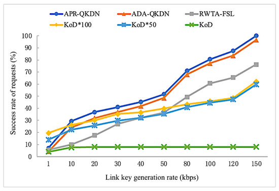 As shown in Figure 8, the success rates of requests corresponding to APR-QKDN, ADA-QKDN, and RWTA-FSL increase significantly with the growth of the link key generation rate, and the changing trends of the three are similar. In the case of KoD without expansion, the success rate of requests remains stable and does not have an increasing tendency. The success rate of requests corresponding to the highly expanded KoD scheme progressively climbs with the growth of the link key generation rate, but the changing trend is relatively moderate. Our scheme offers various advantages over the other three schemes in terms of the success rate of requests, which can improve by around 5% compared to ADA-QKDN and about 20% compared to RWTA-FSL. The APR-QKDN is around 30% better than the KoD scheme with 100x extension; the difference is even greater compared to the unexpanded form of KoD.