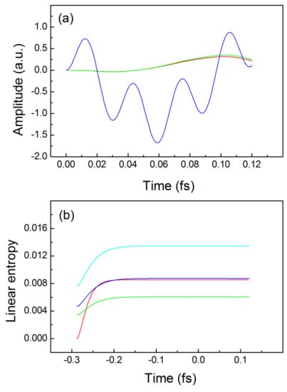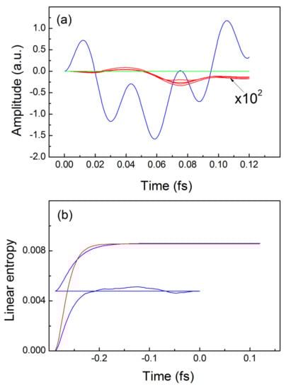Trajectories and linear quantum entropies for interacting electrons: (a) exact trajectories for the driven electron—blue line, for the idler electron—red line, TDQMC result—green line; (b) buildup and real-time dependence of the exact linear entropy—red line, and the TDQMC result for: —blue line, —light-blue line, —green line. In (b), both electrons are driven by the external field.
