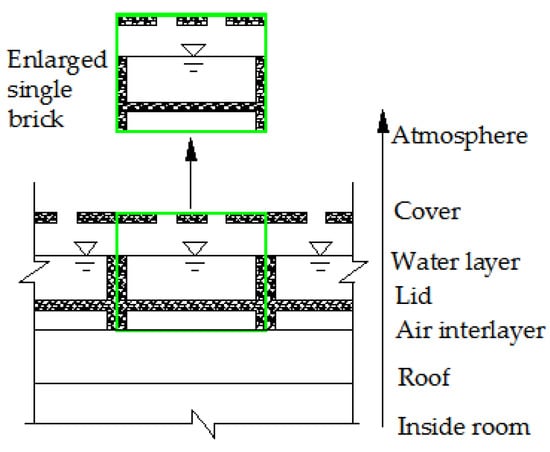 However, no literature mentioned the theoretical and experimental study on the thermal insulation performance of the roof with water-retained bricks as illustrated in Figure 1. Figure 1 is a cross-sectional schematic of the roof with water-retained bricks. The brick is equipped with a movable cover with a strip-hole. The thickness of the cover is 2 cm. Considering the strength of the cover, the distance between two strip-holes is set to 6 cm, and the length of the strip-holes is set at 18 cm, and both ends of the strip-holes are semicircles. The upper layer of the brick stores water, and the lower part is combined with the roof to form an air layer. Moreover, considering the building modulus, the transportation of water-retained bricks and the convenience of construction, the horizontal size of the water-retained bricks is set to 30 × 30 cm. A certain distance is maintained between the side wall of the cofferdam and the cover, which is conducive to ventilation and evaporation. As shown in the figure, above the roof, there are some layers such as the air interlayer, lid, water layer, air layer and cover.